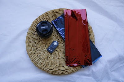 Eu tirei estas fotografias com a ajuda do comando. O comando é uma grande ajuda para quem quer tirar fotografias sozinha.O meu comprei na wish. Vou tentar explicar da melhor maneira. Do lado esquerdo e do lado direito coloquei os candeeiros de secretária com o papel celofane na parte da lâmpada. No meio ficou o tripé com a câmara. A lente que usei é com grande abertura ou seja deixa entrar mais luz do que se fotografa-se com a 18-55m.